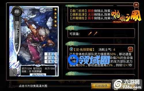 猎狐文丑虽是群雄武将,但以其强大的枪兵适应性,可完美融入多种枪兵阵容,而不局限于群雄。推荐搭配:龙胆赵云、灭奏曹丕、武圣关羽,根据阵容情况可换上乱武贾诩、令香荀彧或小乔等武将,当然也可配上杰女黄月英或斗胆姜维加强前排。如此不同于以往枪兵的慢节奏,对阵目前强势的骑兵时,可利用斩破的高输出8气关羽文丑起手,与骑兵正面刚,后接曹丕龙胆续航与对方打持久战,让枪兵也体验一把速度与激情了!