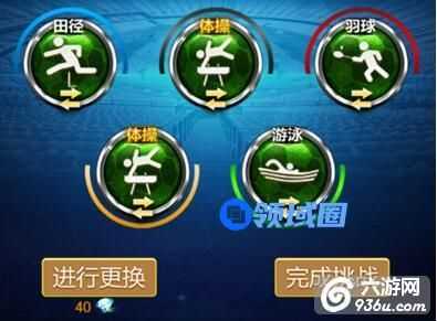 3、开始竞技后可以展示5个竞技项目,完成挑战时5个相同项目获得2块该项目金牌,4个1块金牌,3个1块银牌,2个1块铜牌。(如下图,共有两个体操项目相同,若点击完成挑战,则会获得1块铜牌)
