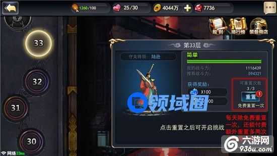 英雄塔总共有100层,而当主公感觉闯关途中有事离开,或者发挥不足,战力吃紧的时候,都可以按左边的暂停键,离开游戏,等强化战力之后再来继续挑战。即使硬闯失败了也没关系,英雄塔每天都会有一次重置机会。