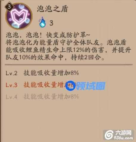 二技能,泡泡之盾,3火群体护盾,护盾值满级为14.88%的鲤鱼精最大生命值,而且还会提升全队10%的效果命中。10%命中对控制类式神,说多不多,说少不少。如果你的控制类式神刚刚好堆到了100%几率控制,那么鲤鱼精可以让对面更少地出现抵抗效果。