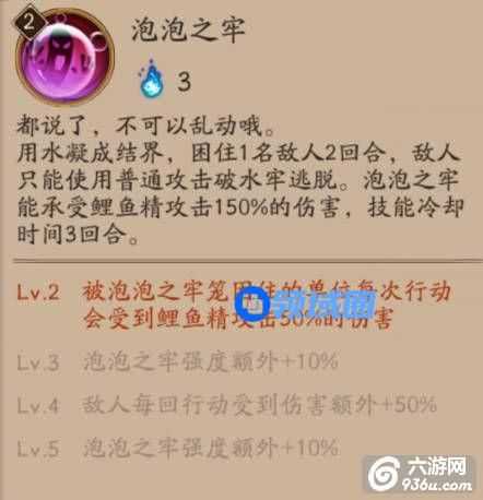 三技能,泡泡之牢,3火单体控制,冷却3回合,控制2回合。被控制的人只能用普通攻击试图打破水牢,一般用来控制一些低攻击力的式神。(告诉我,你都想到了哪些?)