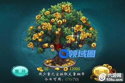 摇钱树:游戏中玩家主线进行到一定阶段时即可解锁摇钱树,玩家花费少量元宝即可兑换巨量的铜币,虽然元宝来之不易,不过每天摇一摇,相信你也不会缺钱花了~