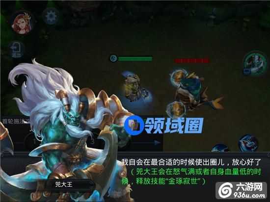 兕大王在实时对战中的能力是目前为止肉盾中最暴力的,满怒气的牛硬的不要不要的,要是再有个魍魉附体,想死都难。玩这个英雄时,跟玩魔王、奎木狼一样记得把智能施法关掉,这时有了冲刺,想打冲人群,想逃跑反向冲,非常灵活。开局不要吝啬嘲讽,在安全的坏境下去嘲讽野怪或小兵积累怒气,半怒以上就可以去干架了,叫上队友一个冲刺,然后嘲讽,等嘲讽时间快过了你的怒气早就满了,接上一个大,你就能控制对手5秒时间,配合经文梵天,敌人想跑都跑不掉,是不是很恐怖!这时你的队友只要不傻,开局之战胜负已定。即使逆风,被迫守塔的情况,我们可以跟玩奎木狼一样,进入人群,反向冲刺,把敌人全部拽到塔里,然后一个嘲讽加大招,配合队友和防御塔,想翻盘也并非难事!