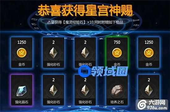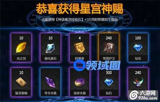 土豪高富帅们的不二选择,200钻石一次的占星虽然价格不菲,但是获得的装备和道具绝对是物超所值的!神话魔灵经验石(必得),珍贵的羽翼培养材料,象征着贵族荣耀的时装券,稀有的三星魔灵,还有各种各样的珍贵道具都能通过钻石占星获得。在这里着重说一下魔灵的重要性,因为存在着缘分系统,所以只有收集更多的魔灵才能有机会激活给力的缘分,大幅提升战斗力。然而三星魔灵合成需要300灵魂石,一点点刷副本的话需要极大的工作量,这也体现出了钻石占星的价值!建议有能力的玩家都在游戏早期进行1-2次的钻石十连,以便在前期就取得优势!
