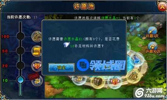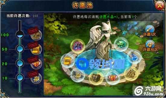 【许愿的道具】每次投入一个许愿水晶就可以向许愿池许愿随机获得许愿池中的精品道具哦!许愿水晶可以通过商城进行购买哦!