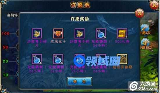 【奖励的发放】许愿获得的奖励,当确认后,将直接发送到角色的背包中,如此时背包已满,则会以邮件附件的方式进行发送。