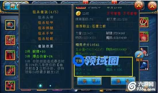 装备觉醒操作可以点击装备-强化按钮打开觉醒系统的界面,对粉色套装(60级)和金色套装(70级)进行100%成功的装备觉醒操作。装备觉醒后,可增加装备的属性同时提升装备的总体评分。