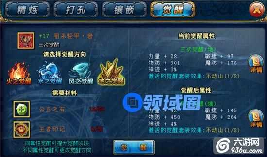 在经过了精炼提升强化等级、打孔和镶嵌提升了属性后,装备已拥有了不俗的能力,在装备强化界面中,加入了“觉醒”功能,让装备有了一个质的飞跃,增加了装备的属性值,提升了玩家自身的实力。