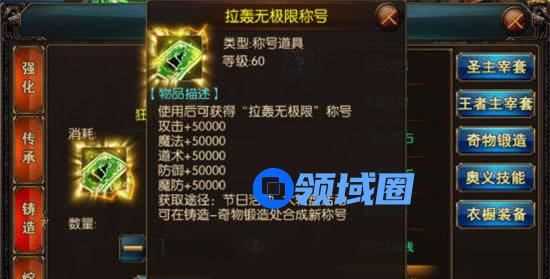 拉轰无极限称号攻击、魔法、道术、魔防、防御属性皆为50000,使用5个拉轰无极限可通过铸造合成更高级称号狂拽酷炫炸天,狂拽酷炫炸天称号攻击、魔法、道术、魔防、防御属性均为100000,伤害加深5%。