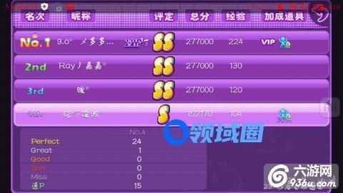 不同的评分得分数可是相差很远喔,miss就是丢失,是没有分的。在游戏中还有一个得分标准,那就是combo数(下图黄色圈部分)。
