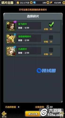 【碎片出售】已有英雄的多余碎片如果不再需要的话,可使用英雄界面右上角的碎片出售功能进行选择性出售。碎片出售后,可换取相应数量的将魂,将魂可在伙伴商店购买其他需要的伙伴碎片。