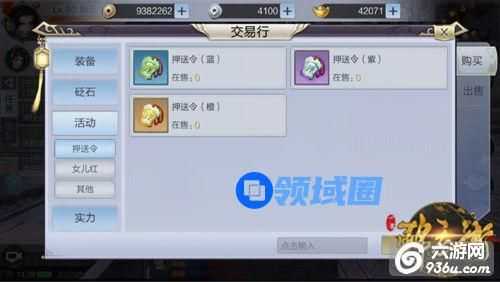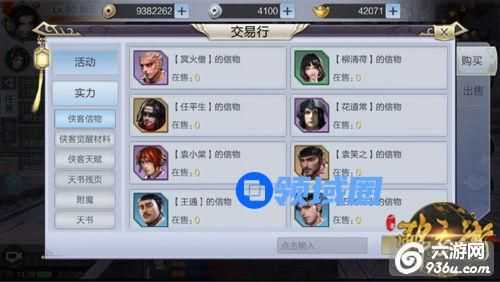 交易行中的实力栏目中有侠客信物、侠客觉醒材料、天赋、天书残叶以及附魔相关的材料。玩家可以将自己通过副本、任务中获得的相应材料在交易行的实力栏中进行出售,或者在此栏目中进行购买。