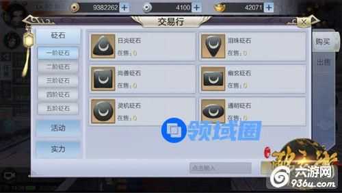 交易行分为装备、砭石、活动、实力等五大类,玩家可以在交易行中根据自己的实际需要进行搜索或者点击相应的大类进行挑选。