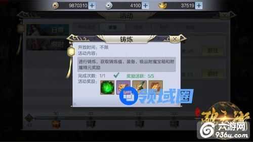 通过任务、副本获得的普通装备可以通过铸炼系统进行提升。玩家通过铸炼可以获得极品附魔宝箱和附魔精元。铸炼装备可以提升铸炼等级,获取铸炼值和高品质装备,橙装铸炼还可以获得附魔道具。