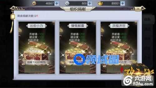 在组织中,玩家可以通过捐献来增加组织的建设度、贡献值以及组织资金。只有建设度达到一定要求之后才可以提升组织的等级,组织资金可以用于培养组织技能。