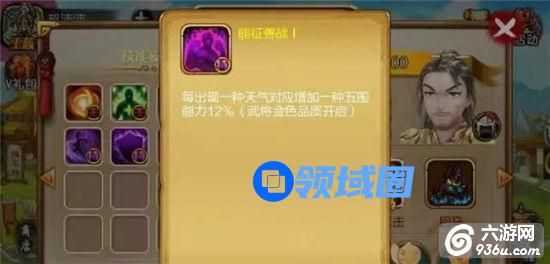 每出现一种天气对应增加一种五围能力12%(武将金色品质开启)