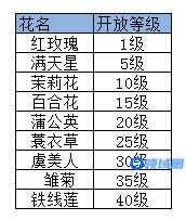 鲜花根据角色的等级开放,等级越高可以种植的鲜花越多,每5级开放一种鲜花;