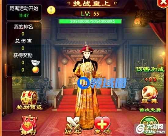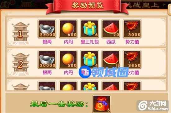 挑战皇上可获得银两和内丹,伤害排名前50名还可以获得皇上礼包、飘花礼物以及势力值,最后一击者可以获得额外的内丹奖励。除此之外,每天挑战皇上前20次战斗可获得少量内丹和银两。