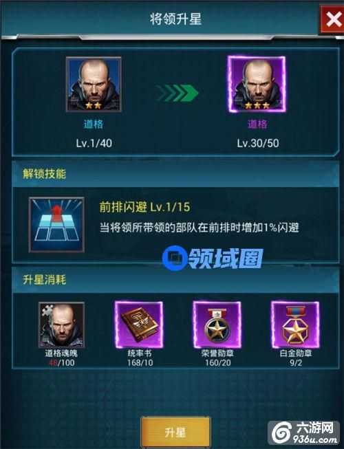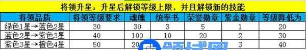 3、将领升星,需要消耗多种材料,包括 同名将领魂魄、统率书、技能勋章、荣誉勋章、紫金勋章,而当前等级会因为升星按比例下降,但将领等级上限提升