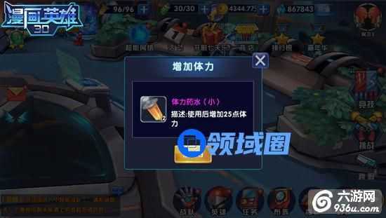 在《漫画英雄3D》的一些系统和活动之中,玩家还能够获得体力药水。不同质量的药水所提供的体力也不一样。玩家们从背包中直接点击药水使用,就能够直接增加自己的体力值。