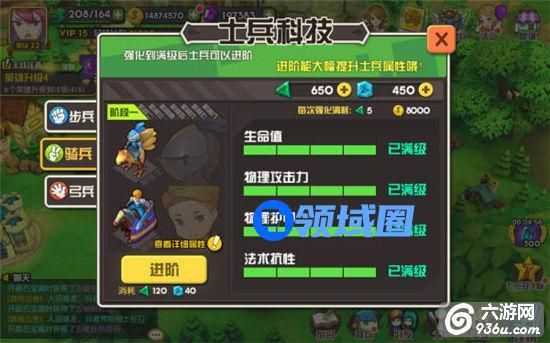 玩家达到20级后开启士兵科技进阶功能,大家可以在游戏主界面右下角的功能区找到它!士兵科技中,一共分三个兵种,分别为步兵、骑兵、弓兵;每个兵种可以强化四种能力,它们分别为:生命力、攻击力、物理防御、法术抗性;每个兵种的四项能力强化满级后,可以进行进阶。初始强化消耗2块符石,随着士兵阶段级别越高,消耗符石的数量会变多。