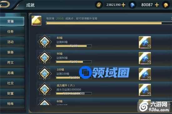 2.成就目标包括八大类:任务,活动,装备,符文,龙魂,社交,财富和特殊。