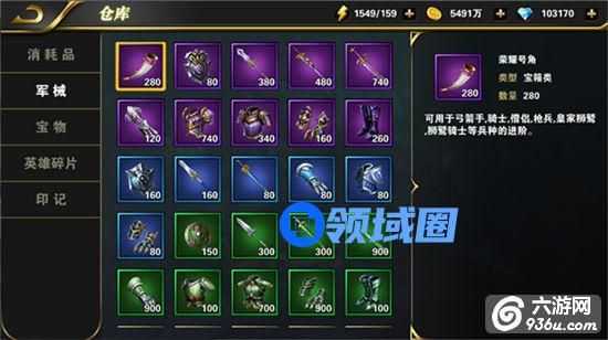 军械栏:所有的军械都将在此显示,玩家可以通过给英雄装备军械来提升英雄品质从而解锁兵种能力,提升英雄实力