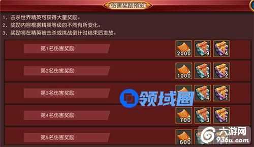 每次挑战《群英天下》世界BOSS获得的奖励,会根据参与者等级的不同从而获得相应的铜币。根据每次挑战BOSS造成的伤害会产生一个伤害排名,排名前十的玩家可以获得升阶材料、经验书奖励。击杀BOSS后还可获得大量铜币。挑战boss时如果为了冲击排行榜可以购买祝福,能够提高伤害和会心,当然这个祝福在每次挑战boss后都有20%的概率获得。