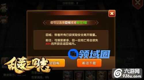 每成功通过一层都会有“安全回城”OR“通往下层”的提示,玩家可以根据自己的实力来选择继续,还是退出。继续,当然会有更丰厚、更珍贵的奖励,但是一旦失败将会损失掉探险背包中大量的战利品哟。一定要三思而后行哟。