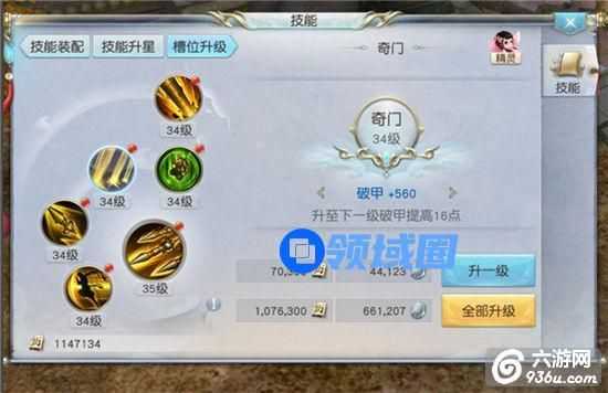对每一个装配的技能进行升级,可以在该界面右侧看到该技能提供的“被动效果”,升级需要的“历练数量”“银币”等等信息;点击“升一级”按钮仅对当前选择技能进行升级,点击“全部升级”对所有槽位的技能进行统一升级;