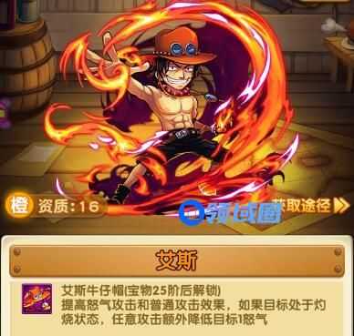艾斯四攻二血羁绊,怒攻系数高于同类橙将,攻击灼伤单位减怒,高闪高爆怒攻灼伤,被普攻送灼伤。