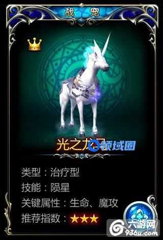 光之龙马和冰雪女王一样,是玩家在游戏前期可以轻松获得的优秀治疗系战宠,可以大幅度提高本方角色和战宠的生存能力。与其他治疗系战宠不一样的是,光之龙马有着出色的输出能力,主动技能陨星可以对敌方单体造成180%的魔法伤害,并且只需要半回合的施法时间,因此在前期的治疗系战宠中脱颖而出,成为最具性价比的战宠。试想,一个具有强大治疗能力的光之龙马,配合冰雪女王等防御型战宠,在战斗中可以生生消耗死对方。作为一个辅助型的战宠,光之龙马的圣痕选择也以保证生存类型优先,包括生命、魔攻、韧性、格挡等属性的圣痕都是优先选择的圣痕类型。