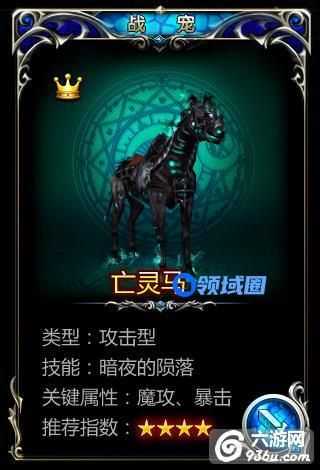 亡灵马是前期非常优秀的攻击战宠,无论是主动技能还是被动技能,都能强化其输出能力。亡灵马的主动技能“暗夜的陨落”可以对敌方全体造成63%的魔法伤害,配合人物的群伤技能,可以轻松秒掉前期的小怪。亡灵马的出手速度非常快,半回合的施法速度在所有的攻击战宠中可谓是出类拔萃。增加暴击和魔攻的被动技能让他的输出能力再上一层楼。作为一个攻击型战宠,在培养属性时亡灵马要放弃防御型的属性,以生命、魔攻、暴击、破格等属性为主,圣痕的选择也要优先选择这四种攻击型的圣痕。