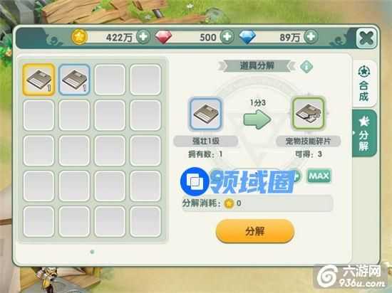 分解可以将道具分解成多个低级道具,分解需要消耗一定数量的金币,分解道具可能会产生意外惊。