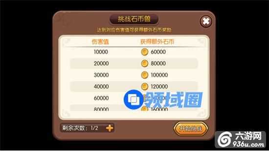 石币兽的攻击不强,但是一定要全力以赴,因为挑战有次数限制,而且攻击度决定你获得金钱的多少,提高你的攻击力,来获得更多金币。每天两次免费挑战次数,每天都会重置挑战次数,PS:用钻石也是可以购买挑战次数。