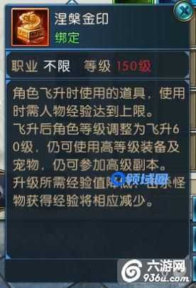 待所有服务器完成飞升任务的总人数达到100000,将在当周维护之后开启飞升功能。当玩家达到150级且满经验的条件下,在河阳城点击包裹使用涅槃金印,即可飞升。飞升后等级提升为飞升60级。仍可使用高级装备及宠物,仍可参加高级副本。升级所需经验值降低,击杀怪物获得经验相应减少。