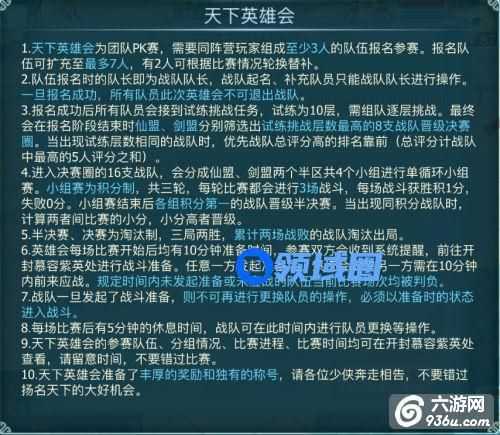 1、天下英雄会为团队PK赛,需要同阵营玩家组成至少3人的队伍报名参赛。报名队伍可扩充至最多7人,有2人可根据比赛情况轮换替补。