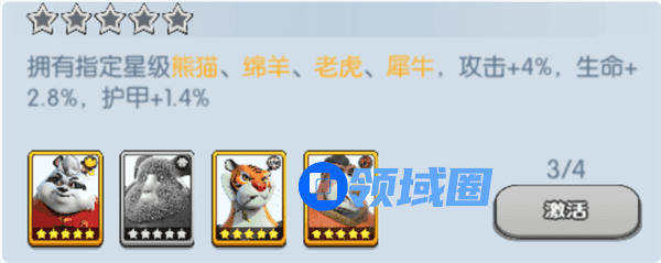 拥有指定星级熊猫、绵羊、老虎、犀牛,攻击+4%,生命+2.8%,护甲+1.4%