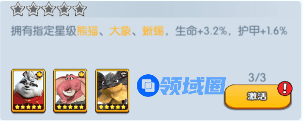 拥有指定星级熊猫、大象、蜥蜴,生命+3.2%,护甲+1.6%