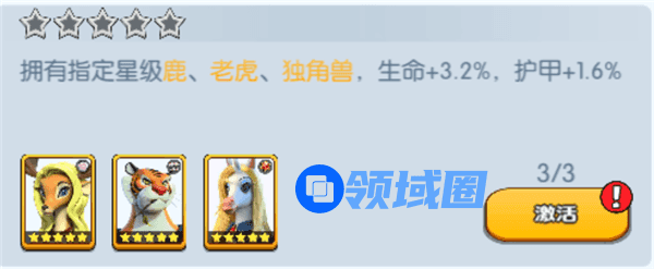 拥有指定星级鹿、老虎、独角兽,生命+3.2%,护甲+1.6%