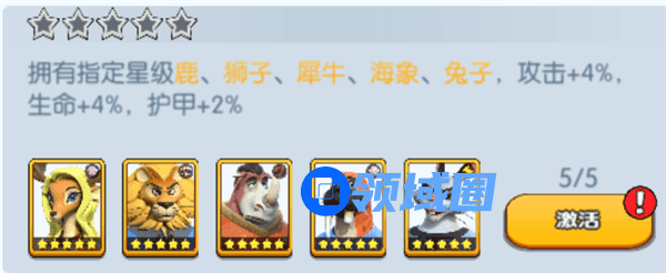 拥有指定星级鹿、狮子、犀牛、海象、兔子,攻击+4%,生命+4%,护甲+2%