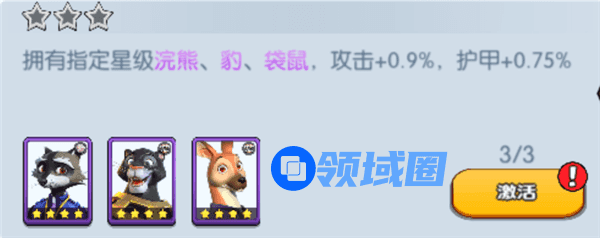 拥有指定星级浣熊、豹、袋鼠,攻击+0.9%,护甲+0.75%’
