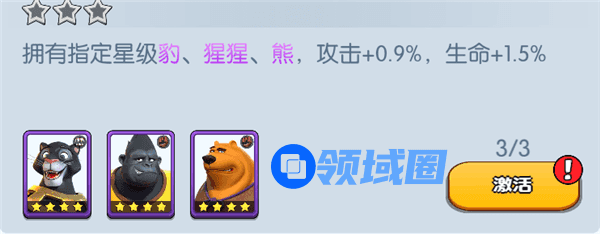 拥有指定星级豹、猩猩、熊,攻击+0.9%,生命+1.5%