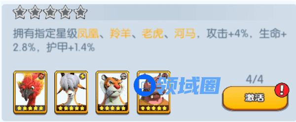 拥有指定星级凤凰、羚羊、老虎、河马,攻击+4%,生命+2.8%,护甲+1.4%