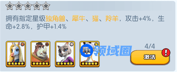 拥有指定星级独角兽、狒狒、牛、绵羊、野猪,攻击+4%,生命+4%,护甲+2%