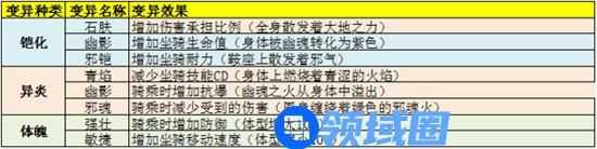 烈战犀牛拥有三个变异种类,每类中的变异状态可单独出现,也可多类状态叠加出现。如图所示: