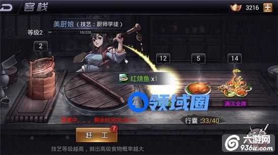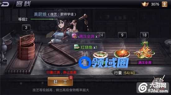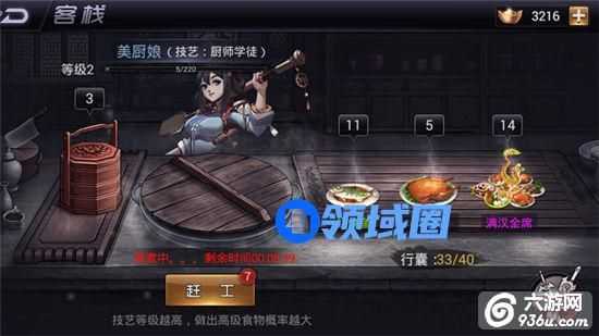 客栈系统中,会显示美食打造时间,行囊,赶工,食物种类,厨娘等级等内容。