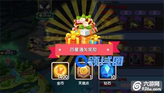 除此之外还要特别提醒一下通关星数。点击星星查看,关卡的通关最高星数为4星。训练师根据通关的星级要求通关副本,可以获得星级奖励。奖励中除了通用的钻石以及金币的奖励之外还将获得天赋点。
