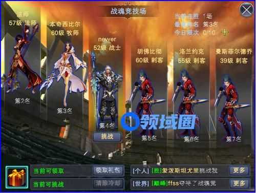 在战魂竞技场界面中,将会显示6名人物,分别是你自己、以及在竞技场排名中排在你前面的5名人物,以及显示了每日排名礼包、每日限次等信息,如图-2。