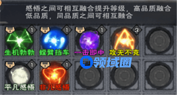 感悟是我们前期游戏中可以直接提升自身和侠客属性的一种可装备道具(下图),分为绿、蓝、紫、金,感悟品质由绿到金递增,不同品质相同属性的感悟提升的数值不一,而感悟可以通过相互吞噬升级从而进一步提升属性,等级见感悟右上角的数字,但是感悟直接用来吞噬就显得极不划算,所以便有了下图中的平凡感悟和非凡感悟,它们用来给感悟提升等级,
